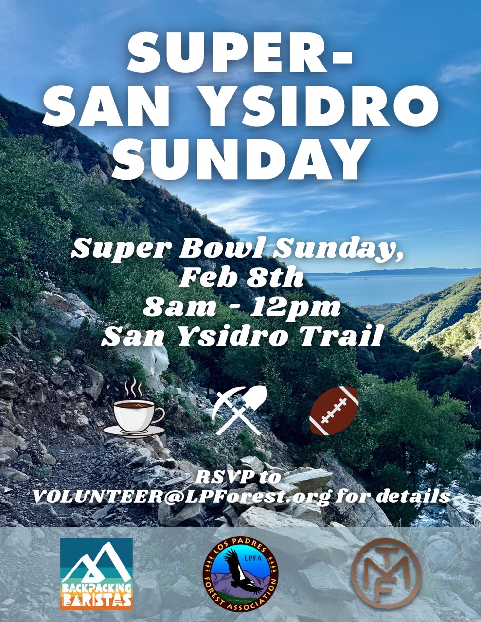 LPFA is teaming up with the Backpacking Barista’s and the Montecito Trails Foundation for a Super Bowl Sunday project on the San Ysidro Trail! Join us on Sunday, February 8th from 8am – 12pm. LPFA hosts a Super Bowl project each year, with the goal of getting you out on the trail in the morning and returning in time to still make that Super Bowl party. And this year’s project will be the superest one yet: all volunteers will get to enjoy quality craft coffee on trail, courtesy of the Backpacking Baristas. We’ll also be giving away a few squares for our HLP Super Bowl Fundraiser to those who join…. Don’t miss this one folks. Sign on up and join the party!