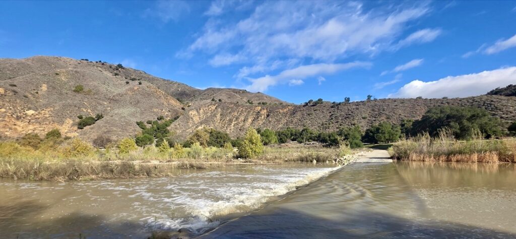 The Santa Ynez River flowing strong again over the Sage Hill Crossing. photo, Chris O.